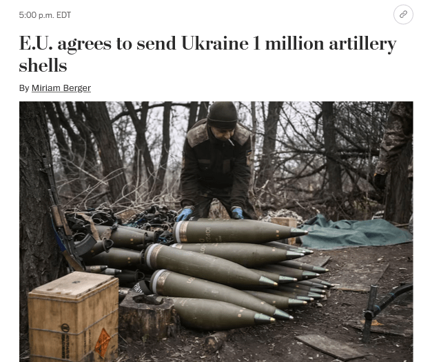 And the message of the article is quite different too. Seventeen E.U. states, and Norway, had agreed to send Ukraine a million shells over the next two years, with other states interested in joining an expanded program in the future. WaPo writers featured the words of Estonia’s Defense Mininster, Hanno Pevkur, who showed off his can-do spirit by explaining, “There are many, many details still to [be] solved but for me, it is most important that we conclude these negotiations and it shows me one thing: If there is a will, there is a way.”